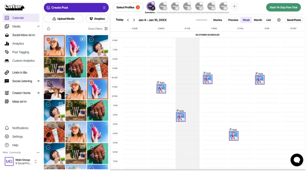 Later emerged from Instagram’s visual ecosystem and built its reputation on one core strength: letting you see how your feed will look before posting. The Visual Planner displays your upcoming posts in grid format, where you drag and drop content until the esthetic matches your vision. This preview eliminates the guesswork about color patterns, spacing, and visual flow that Instagram-focused brands need.