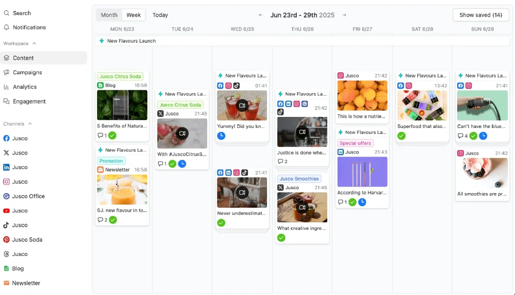The visual content calendar supports drag-and-drop scheduling across four distinct views. Calendar view displays posts with actual previews rather than text summaries. Grid view simulates Instagram’s native layout. You can rearrange posts until your feed esthetic matches your vision. Feed view shows content exactly as it appears on each platform and eliminates guesswork about final formatting. List view enables bulk actions like approving, scheduling, or deleting multiple posts across workspaces at once.